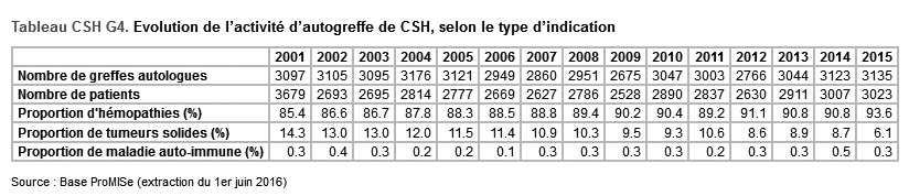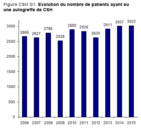 En 2015, tous les centres répertoriés par l’Agence de la biomédecine ont déclaré leur activité d’autogreffe : 3 135 greffes autologues ont été réalisées pour 3 023 patients qui ont reçu une ou plusieurs autogreffes. Les chiffres sur les 10 dernières années montrent que l’activité d’autogreffe est globalement stable autour de 2 500 à 3 000 patients autogreffés par an (Figure CSH G1).