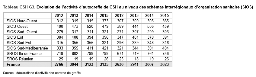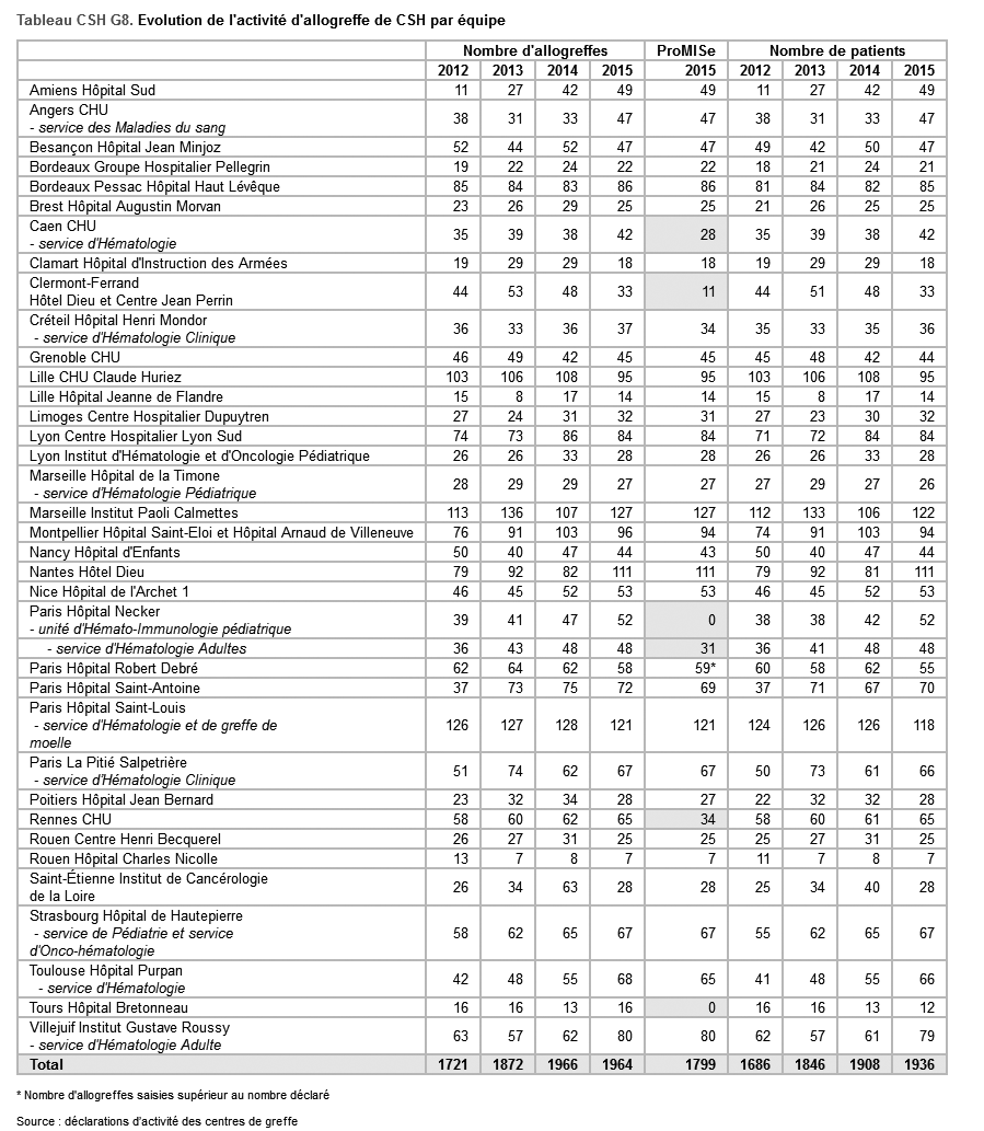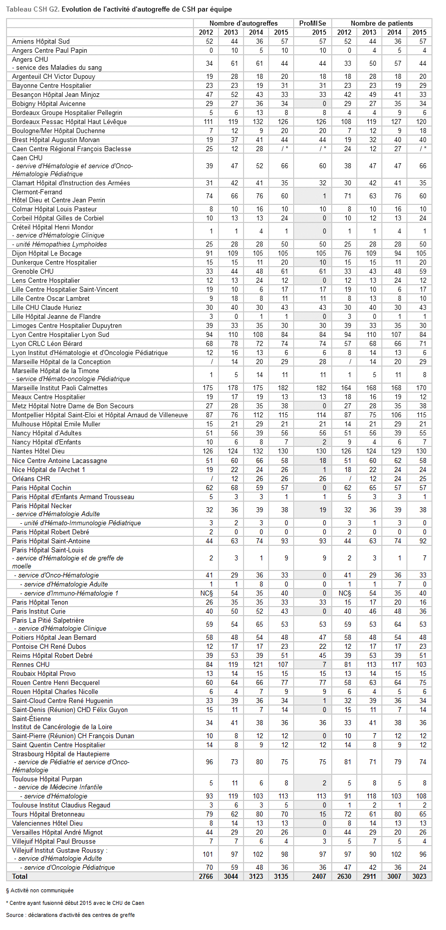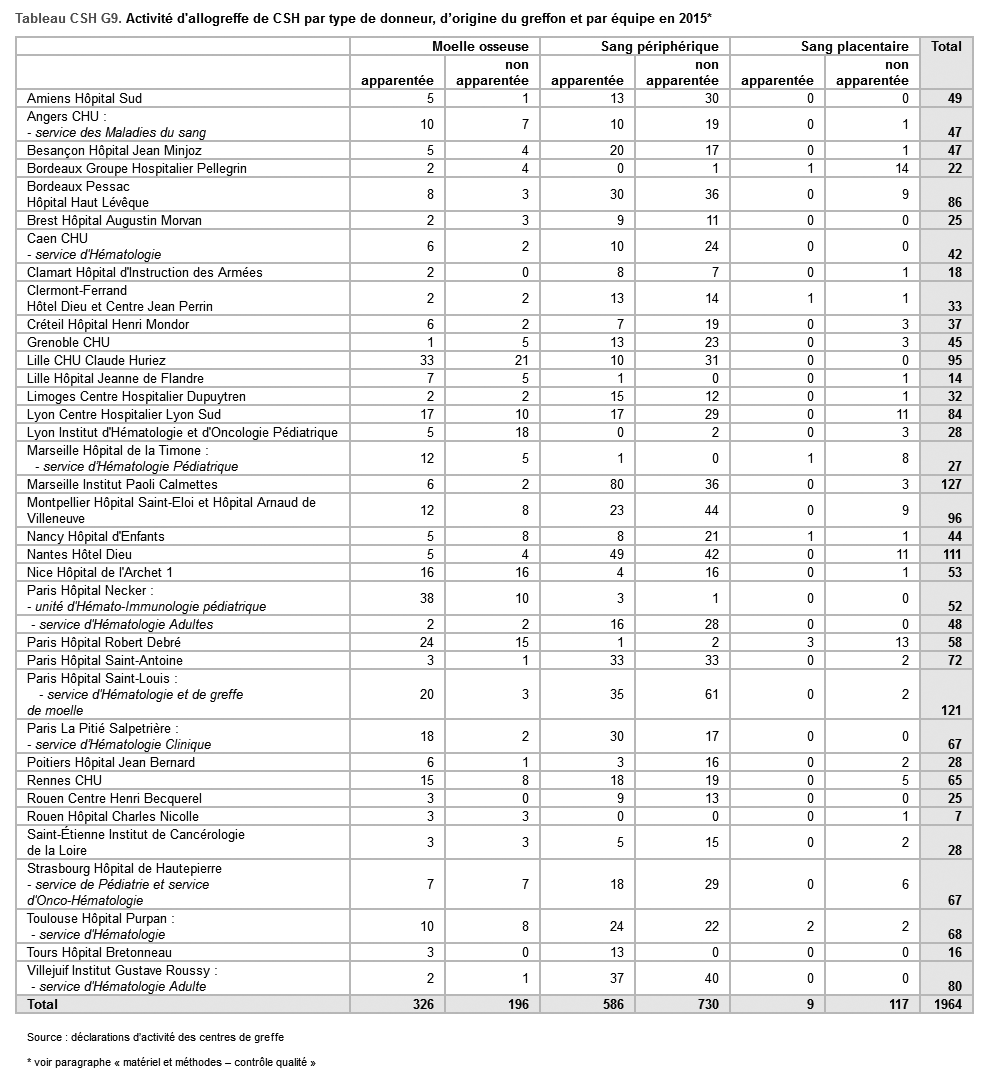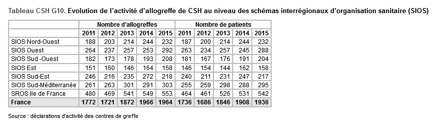 En 2015, 78 centres français ont réalisé des greffes de cellules souches hématopoïétiques (CSH). Cette activité est divisée en deux catégories : greffes allogéniques et greffes autologues. Parmi ces 78 centres, 41 n’ont réalisé que des autogreffes, 2 n’ont réalisé que des allogreffes et 35 ont eu une activité mixte.