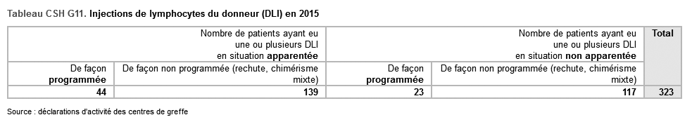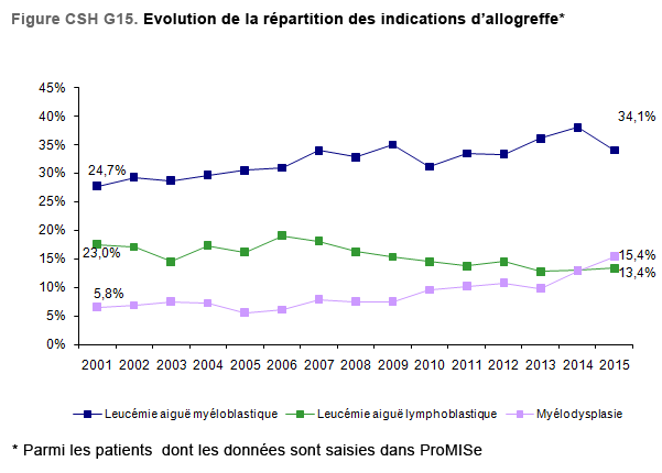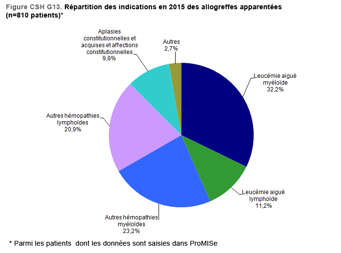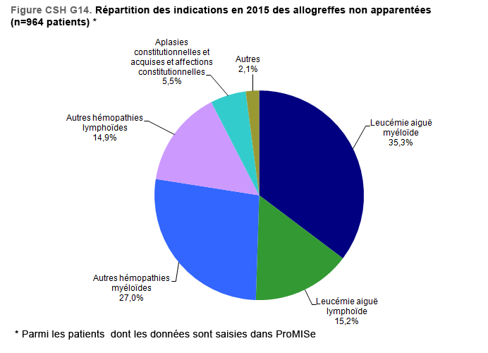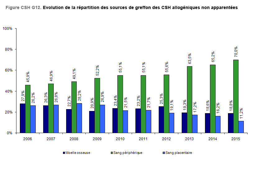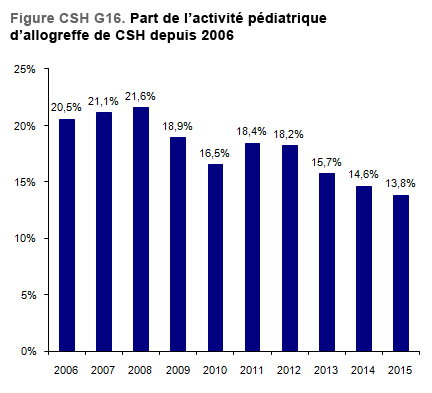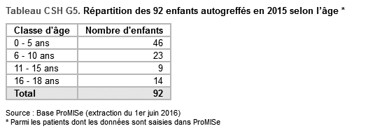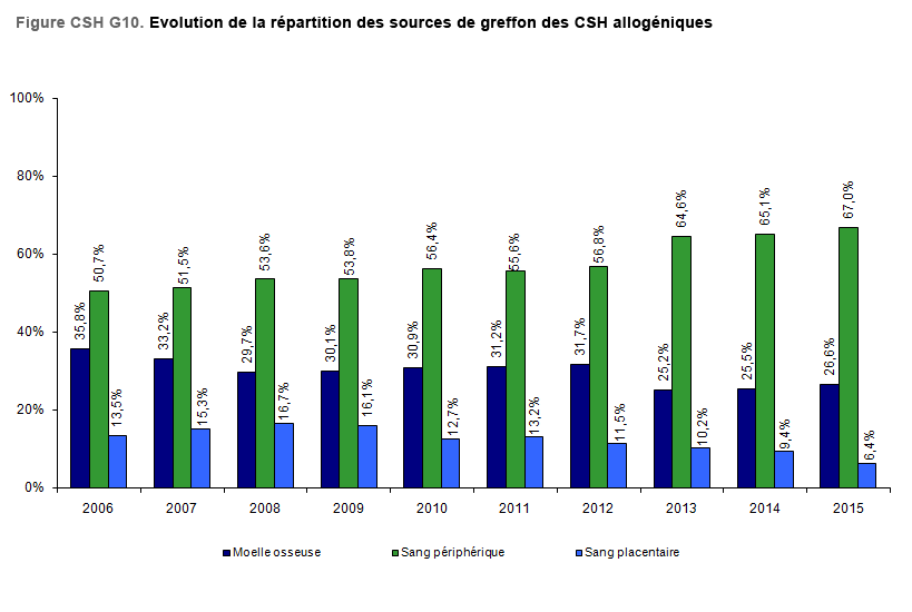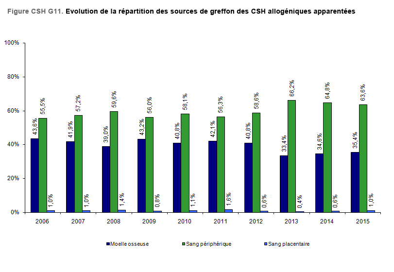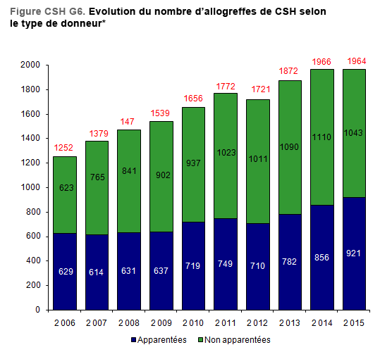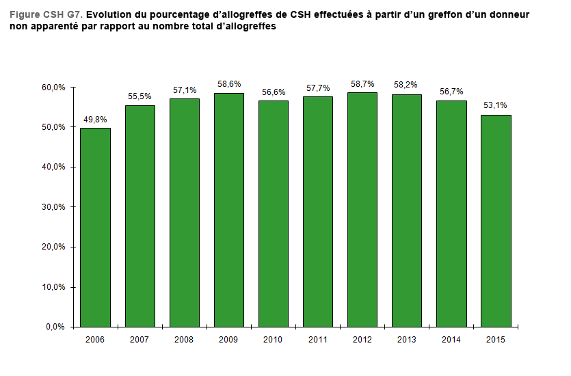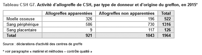 En 2015, 78 centres français ont réalisé des greffes de cellules souches hématopoïétiques (CSH). Cette activité est divisée en deux catégories : greffes allogéniques et greffes autologues. Parmi ces 78 centres, 41 n’ont réalisé que des autogreffes, 2 n’ont réalisé que des allogreffes et 35 ont eu une activité mixte.
