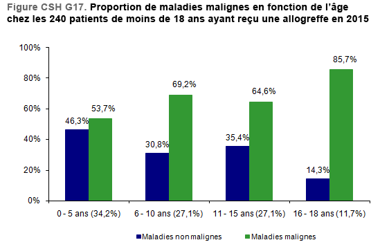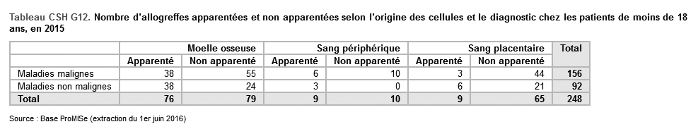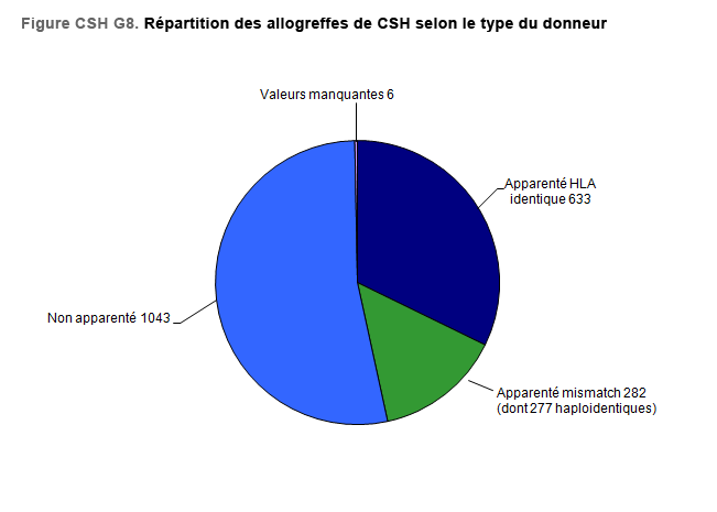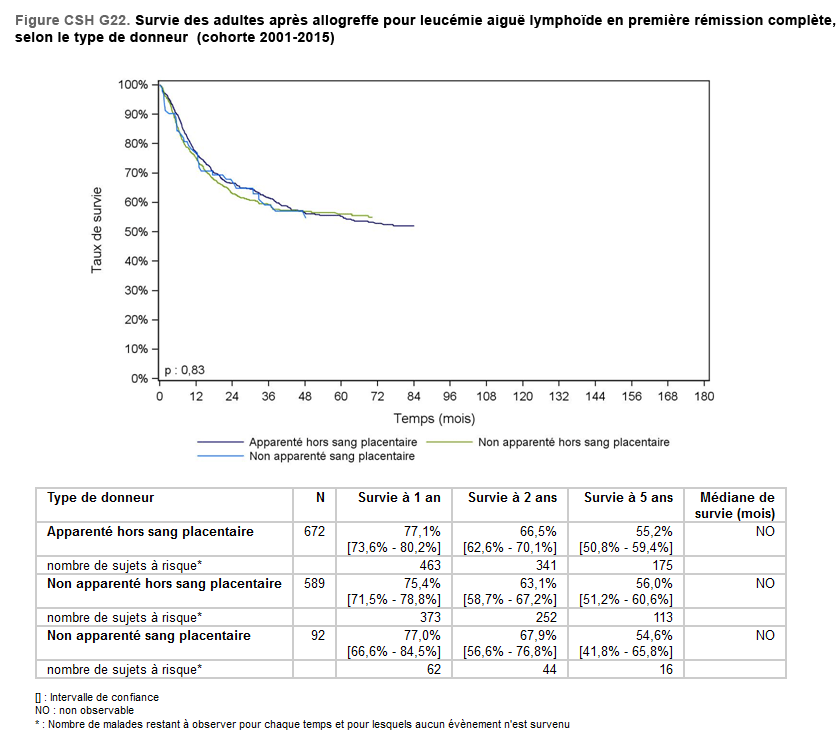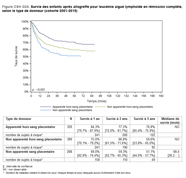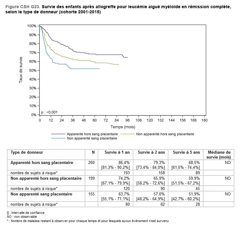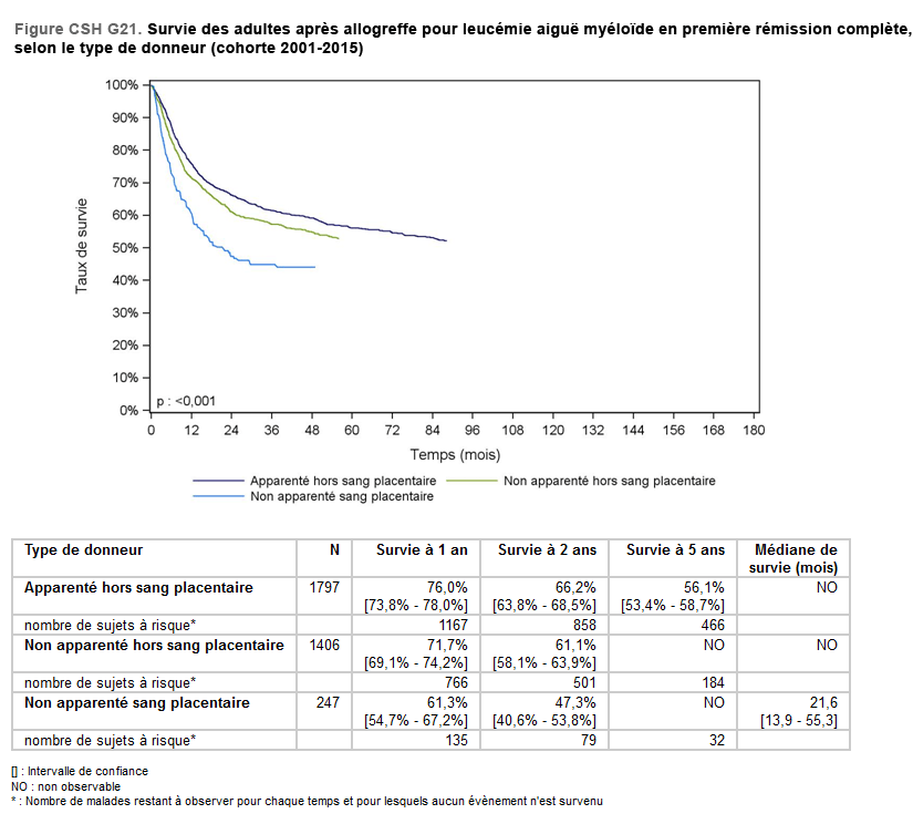 Les greffes avec un greffon issu du sang placentaire n’ont pas été incluses, du fait d’un nombre de patients trop faible ne permettant pas de les distinguer.