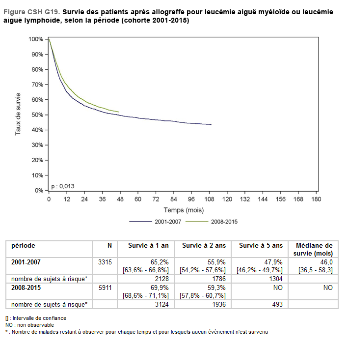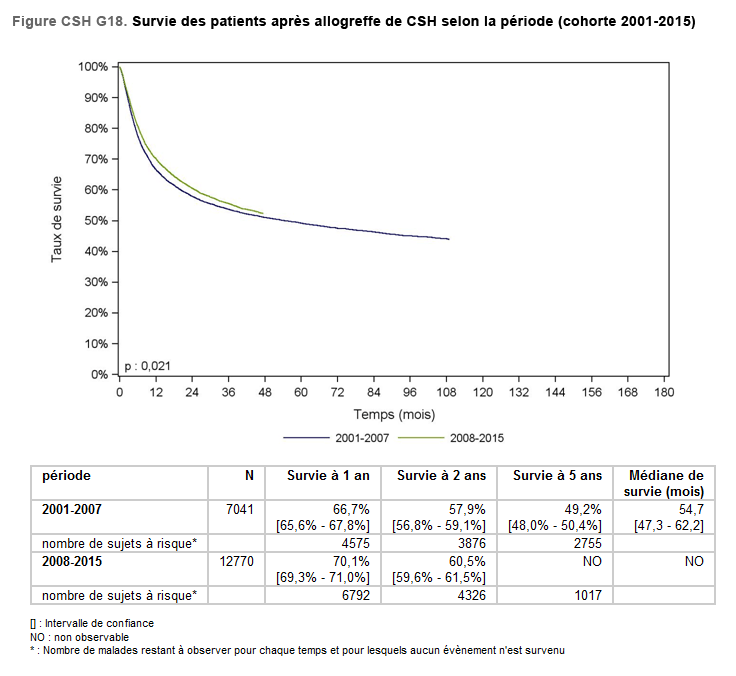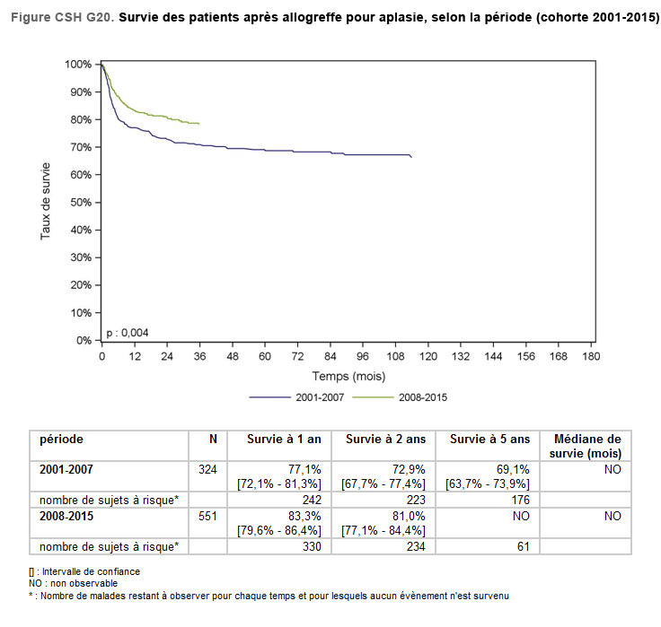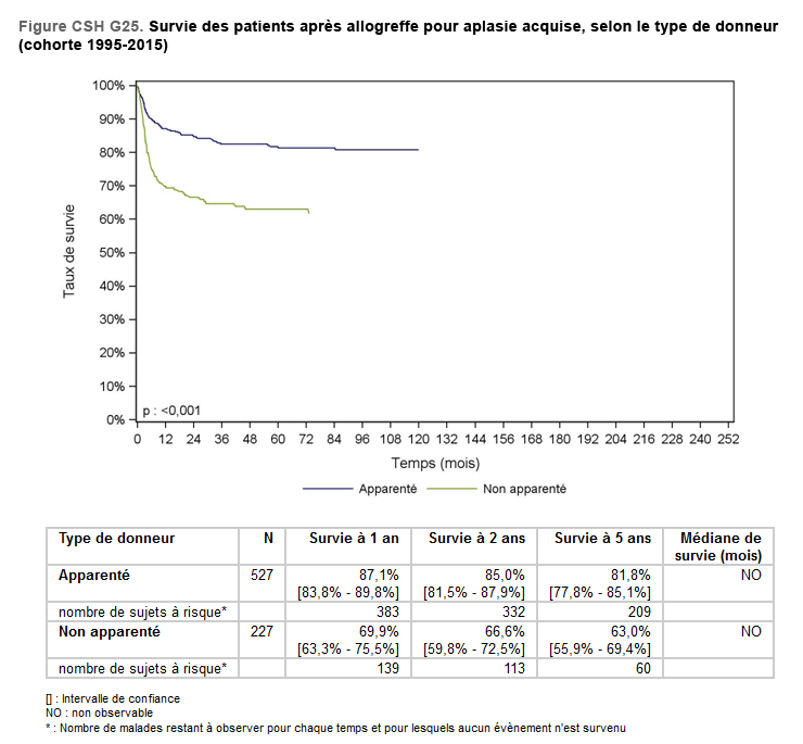 Les figures suivantes (Figure CSH G25, Figure CSH G26) ont été réalisées à partir d’une cohorte large (1995-2015) et sans distinguer enfants et adultes, en raison du faible effectif des patients allogreffés pour aplasie.