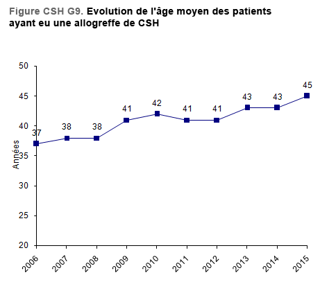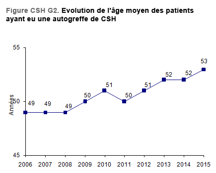 L’âge moyen des patients recevant une greffe de CSH autologue est de 53 ans. L’âge médian de ces patients est de 57 ans et 12,3% d’entre eux ont plus de 65 ans (Figure CSH G2).