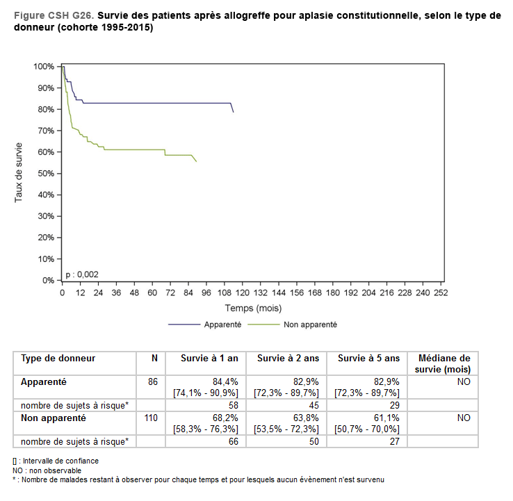 Figure CSH G26. Survie des patients après allogreffe pour aplasie constitutionnelle, selon le type de donneur (cohorte 1995-2015)