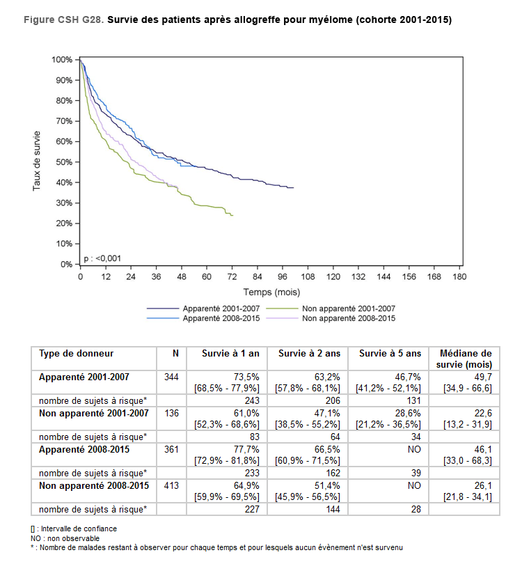 Figure CSH G28. Survie des patients après allogreffe pour myélome (cohorte 2001-2015)