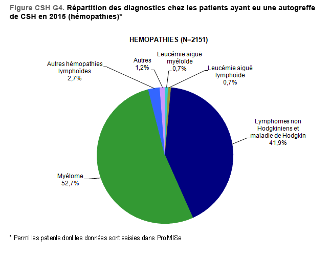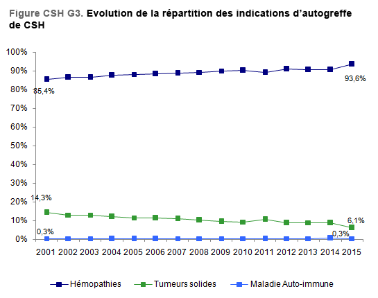 En 2015, le nombre de patients ayant bénéficié d’une autogreffe est de 3 023. Parmi eux, 2 297 patients ont eu leurs données saisies dans la base européenne ProMISe (76%), ce qui permet de répartir les indications d’autogreffe comme suit : 2 151 patients ont été traités dans le cadre d’hémopathies essentiellement malignes (93,6%), 139 (soit 6,1%) dans le cadre d’une tumeur solide et 7 patients (0,3%) ont été traités dans le cadre d’une maladie auto-immune (Tableau CSH G4, Figure CSH G3, Figure CSH G4). Néanmoins, les données de 726 patients n’ayant pas été saisies, cette répartition des indications est à interpréter avec réserve.