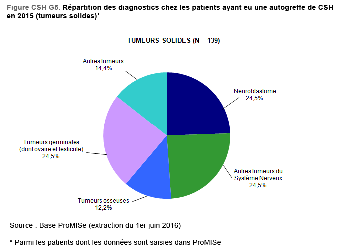 Les lymphomes et les myélomes représentent respectivement 41,9% et 52,7% des indications d’autogreffe pour hémopathie, et sont donc les indications majeures d’autogreffe (Figure CSH G4). Les autogreffes pour tumeur solide sont majoritairement réalisées dans le cadre de neuroblastomes, d’autres tumeurs du système nerveux ou de tumeurs germinales (Figure CSH G5). Les autres indications minoritaires sont multiples et controversées (Figure CSH G3, Figure CSH G4, Figure CSH G5).