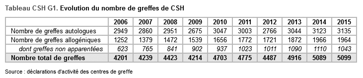 Tableau CSH G1. Evolution du nombre de greffes de CSH