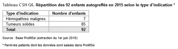 Le tableau CSH G2 rapporte l’activité d’autogreffe telle qu’elle a été déclarée par chaque centre. Dans la colonne centrale est notée l’activité extraite de la base de données ProMISe. En grisé sont indiqués les centres qui ont saisi dans ProMISe moins des trois quarts des greffes réalisées, soit 33% de la totalité des centres.