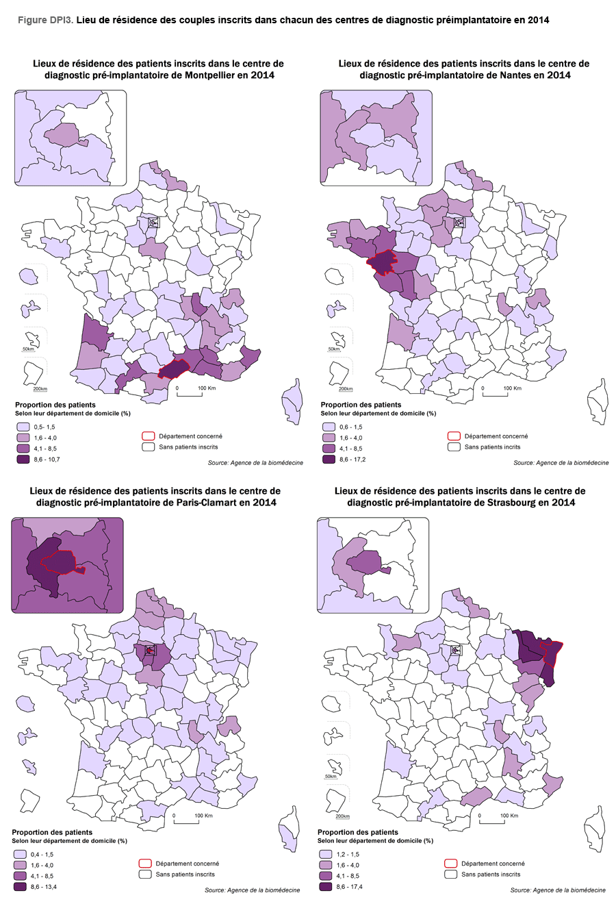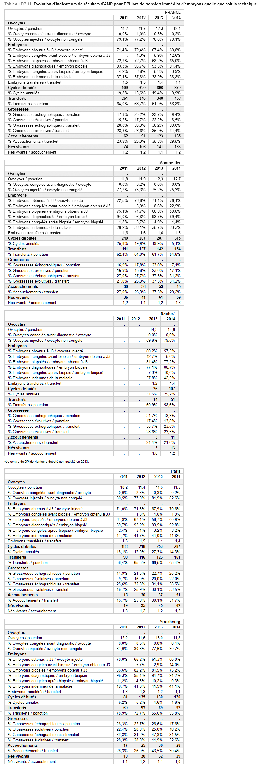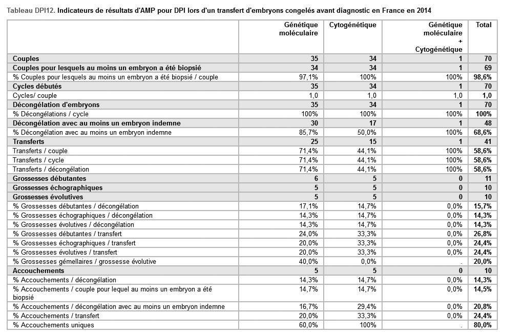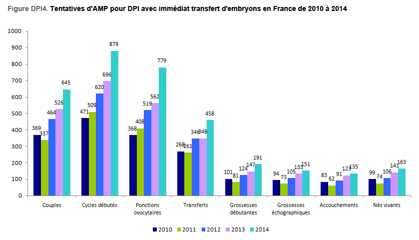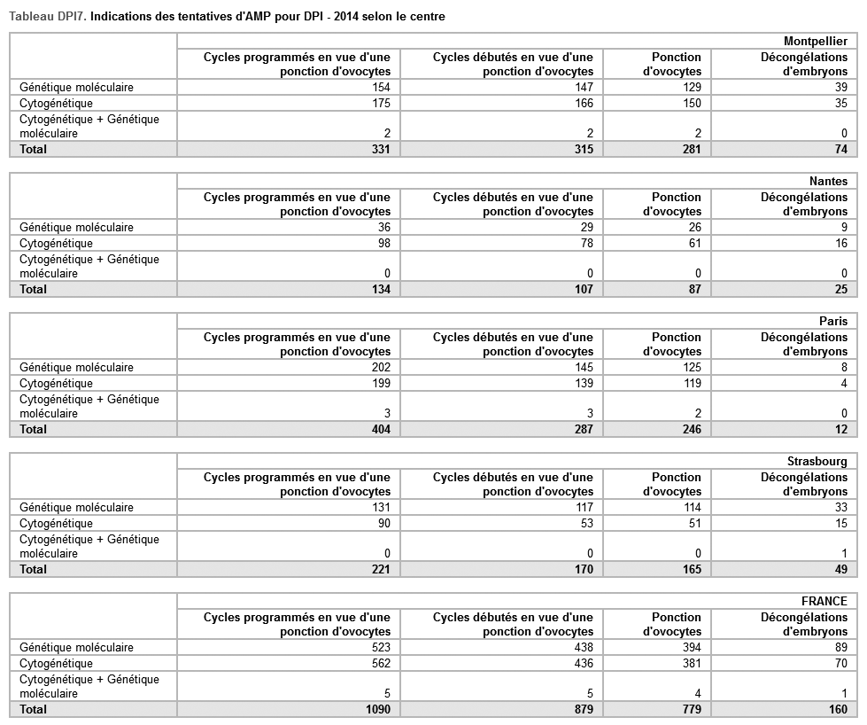 Les centres de diagnostic préimplantatoire adressent chaque année leur bilan d’activité à l’Agence de la biomédecine. Les informations concernent le bilan des demandes et des tentatives d’AMP de l’année N-2 afin de pouvoir renseigner l’issue des tentatives jusqu’à l’accouchement. Il faut noter qu’il n’y a pas forcément de liens entre les demandes et les tentatives d’AMP d’une même année. En 2014, la France comptait quatre centres de diagnostic préimplantatoire (DPI).