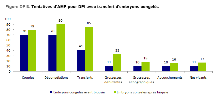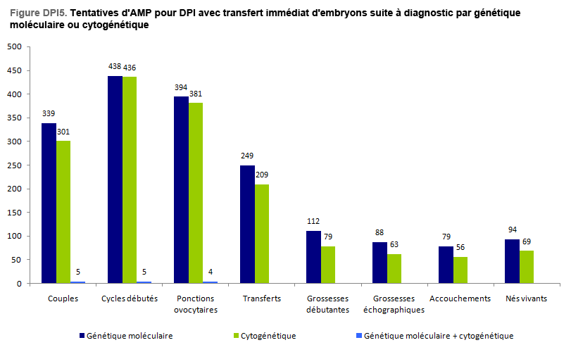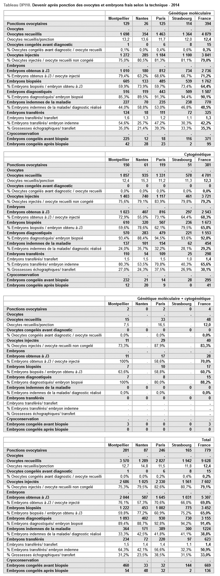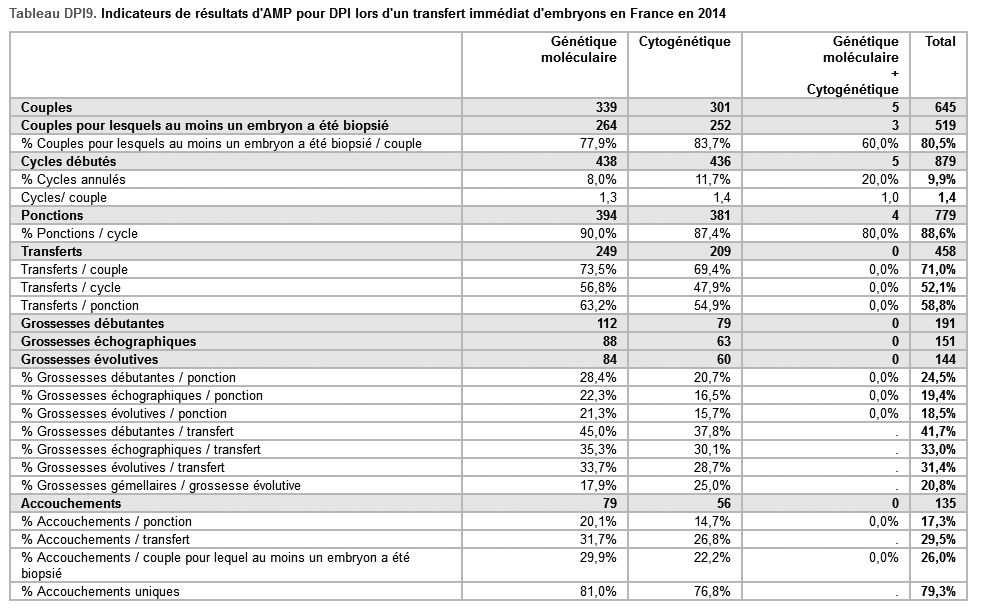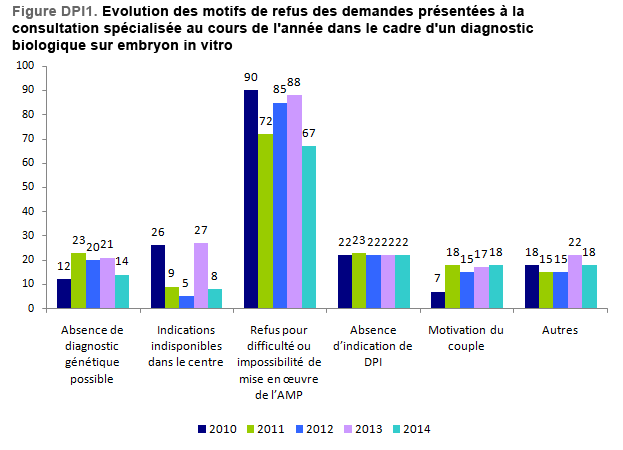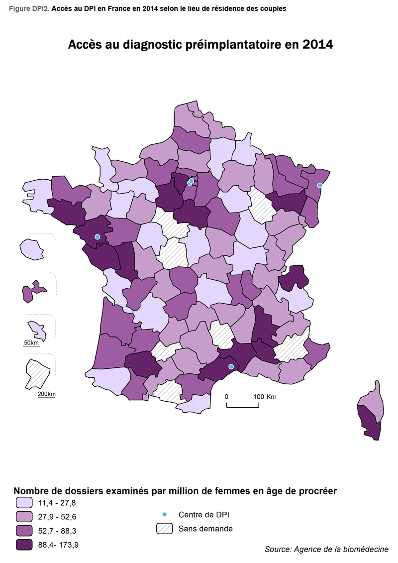 Les centres de diagnostic préimplantatoire adressent chaque année leur bilan d’activité à l’Agence de la biomédecine. Les informations concernent le bilan des demandes et des tentatives d’AMP de l’année N-2 afin de pouvoir renseigner l’issue des tentatives jusqu’à l’accouchement. Il faut noter qu’il n’y a pas forcément de liens entre les demandes et les tentatives d’AMP d’une même année. En 2014, la France comptait quatre centres de diagnostic préimplantatoire (DPI).