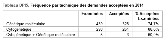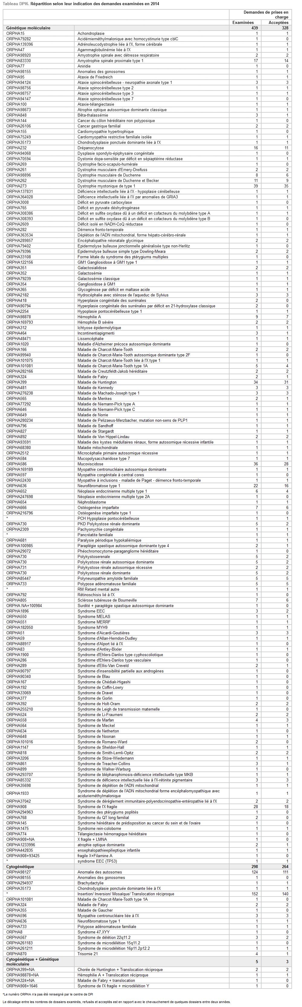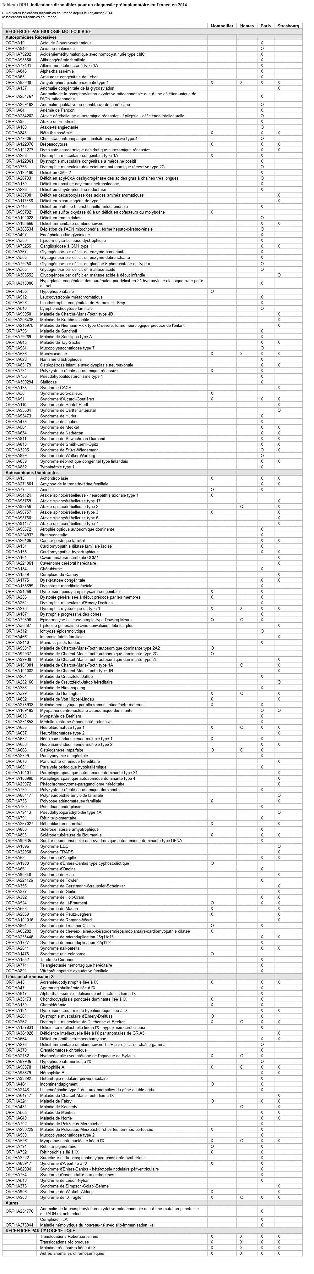 Tableau DPI1. Indications disponibles pour un diagnostic préimplantatoire en France en 2014