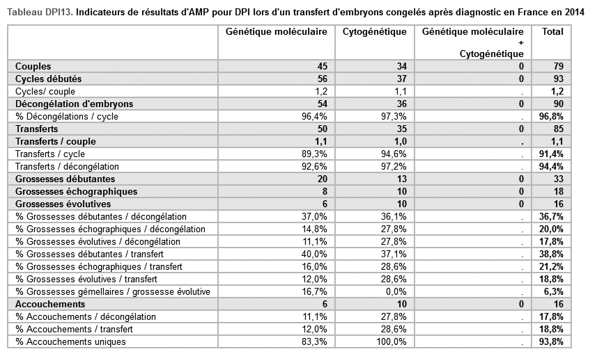 Tableau DPI13. Indicateurs de résultats d'AMP pour DPI lors d'un transfert d'embryons congelés après diagnostic en France en 2014