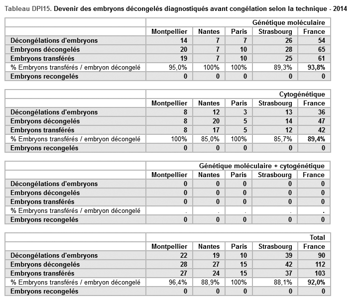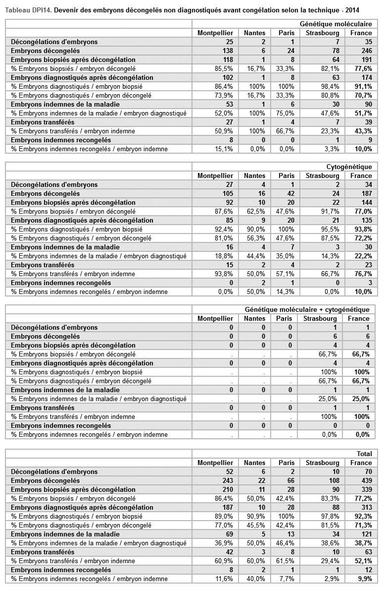Tableau DPI14. Devenir des embryons décongelés non diagnostiqués avant congélation selon la technique - 2014
