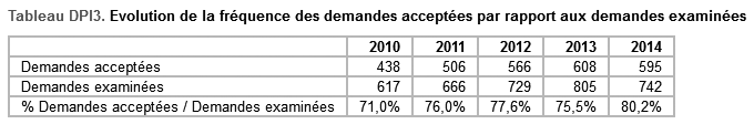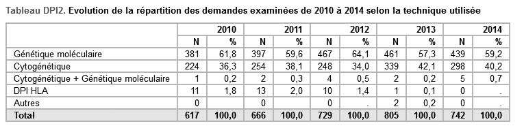 La liste des indications disponibles est représentée dans le tableau DPI1. Les indications sont réparties selon le mode de transmission et selon la technique (génétique moléculaire, cytogénétique) en s’appuyant sur la classification Orphanet des affections. Il est à noter qu’une maladie n’est associée qu’à un seul numéro Orpha même si plusieurs gènes peuvent en être la cause. Or une mise au point est nécessaire pour chaque gène. Pour comptabiliser le nombre d’indication disponibles le nombre de gènes n’a pas été pris en compte sauf pour les situations où le mode de transmission était différent. Au total, sur cette base, outre les anomalies de structure décelées en cytogénétique, près de 202 indications différentes de génétique moléculaire sont disponibles sur le territoire, parmi lesquelles 127 ne sont disponibles qu’au niveau d’un seul des quatre centres de DPI (104 pour le centre de Paris). En 2014, 29 nouvelles indications ont été rendues disponibles à l’échelle nationale.