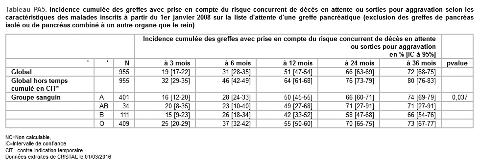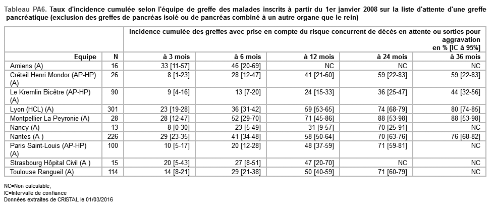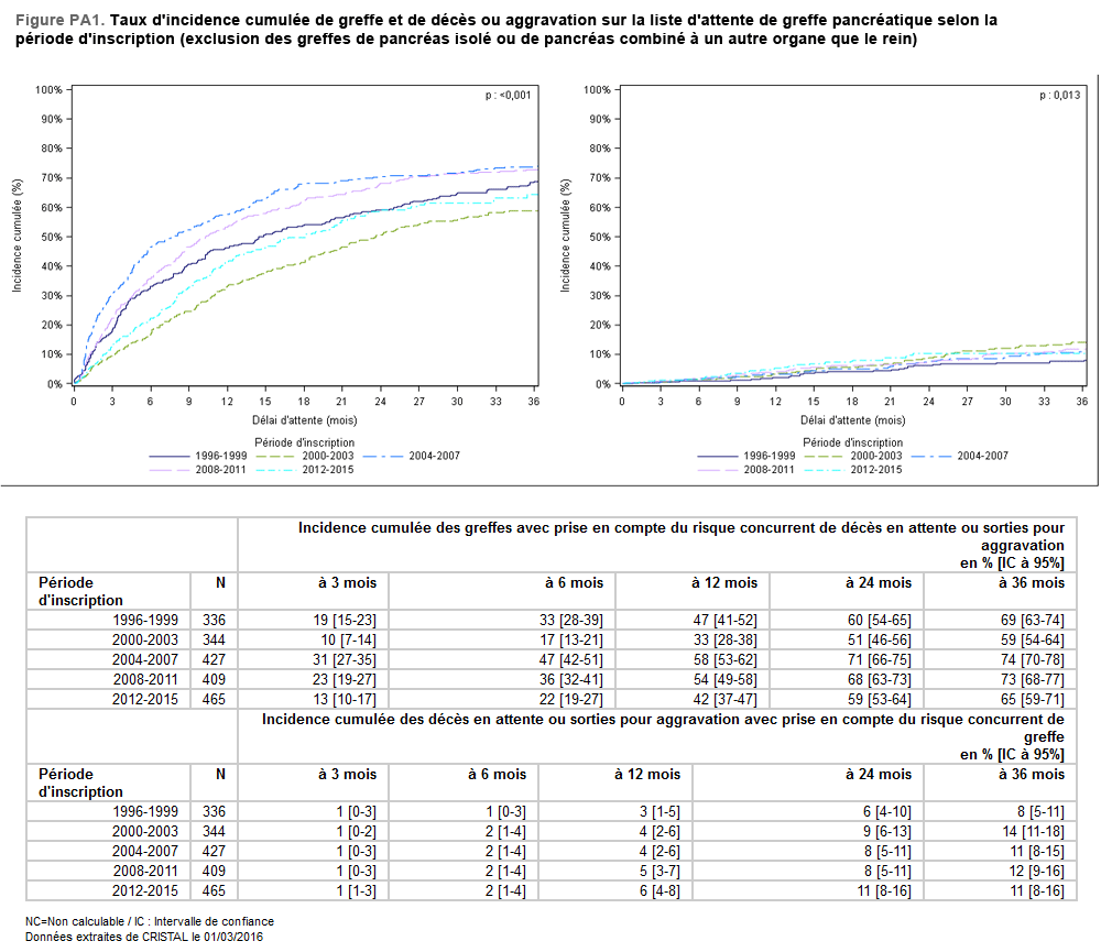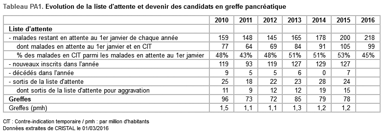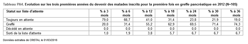 Tableau PA1. Evolution de la liste d'attente et devenir des candidats en greffe pancréatique