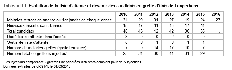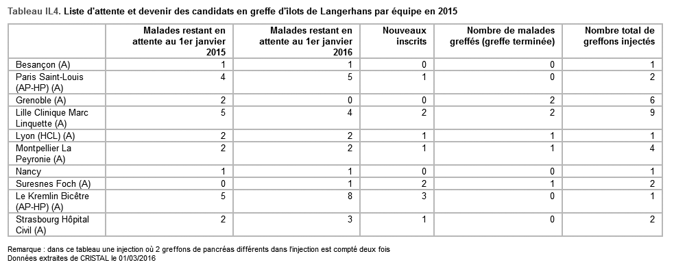 Tableau IL4. Liste d'attente et devenir des candidats en greffe d'îlots de Langerhans par équipe en 2015