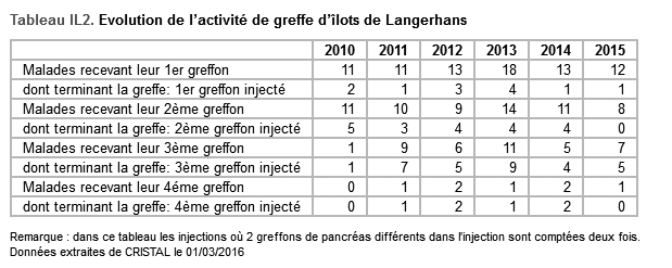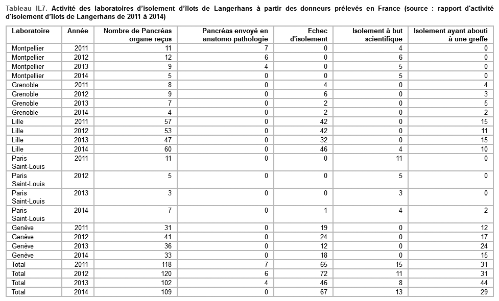 Tableau IL7. Activité des laboratoires d’isolement d’îlots de Langerhans à partir des donneurs prélevés en France (source : rapport d'activité d'isolement d’îlots de Langerhans de 2011 à 2014)