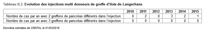 Tableau IL3. Evolution des injections multi donneurs de greffe d’îlots de Langerhans