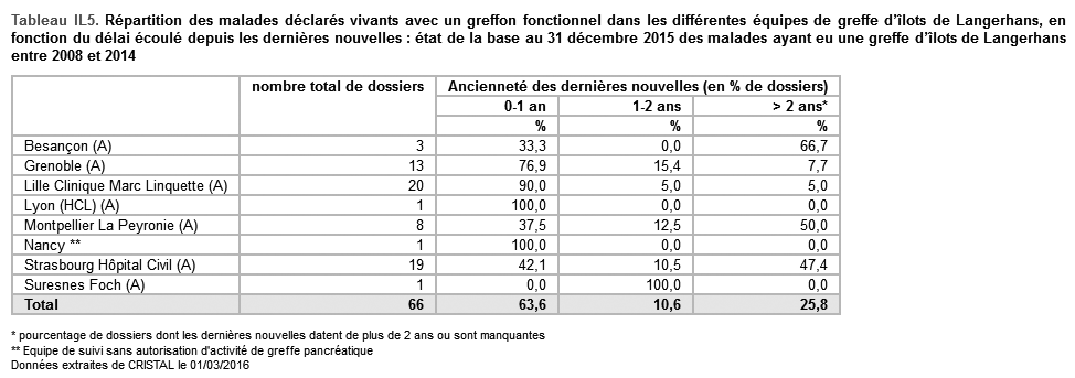Tableau IL5. Répartition des malades déclarés vivants avec un greffon fonctionnel dans les différentes équipes de greffe d’îlots de Langerhans, en fonction du délai écoulé depuis les dernières nouvelles : état de la base au 31 décembre 2015 des malades ayant eu une greffe d’îlots de Langerhans entre 2008 et 2014