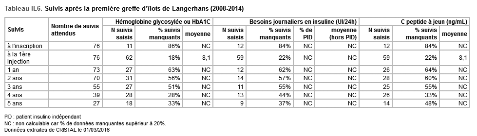 Tableau IL6. Suivis après la première greffe d’îlots de Langerhans (2008-2014)