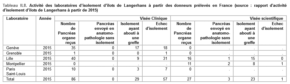 Tableau IL8. Activité des laboratoires d’isolement d’îlots de Langerhans à partir des donneurs prélevés en France (source : rapport d'activité d'isolement d’îlots de Langerhans à partir de 2015)