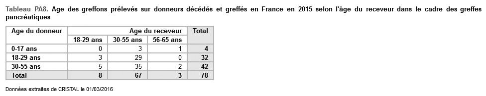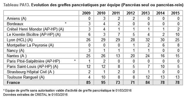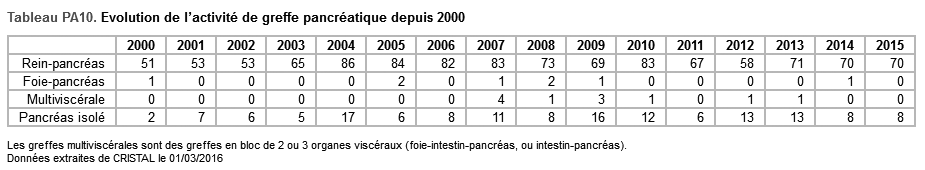 En 2015, avec la réalisation de 78 greffes, l’activité de greffe pancréatique est stable après la baisse de 7 % enregistrée en 2014 après la reprise observée en 2013. Avec 127 nouveaux inscrits, les inscriptions sont stables. L’incidence de 1,2 greffes par million d’habitants est faible par rapport à celle observée chez nos voisins (en 2014 : Allemagne 1,5 ; Suisse 1.3, Suède 4 ; Norvège 6,1 ; Royaume Uni 3,8).