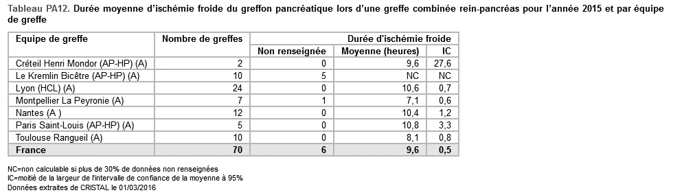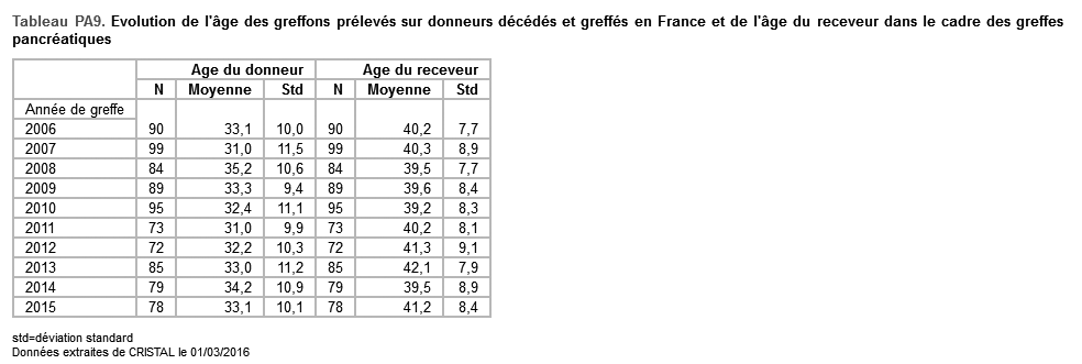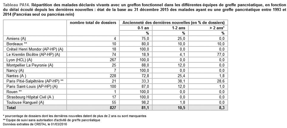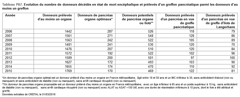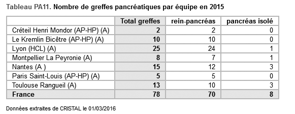 Remarque : dans ce tableau une injection où 2 greffons de pancréas différents dans l’injection est compté deux fois
