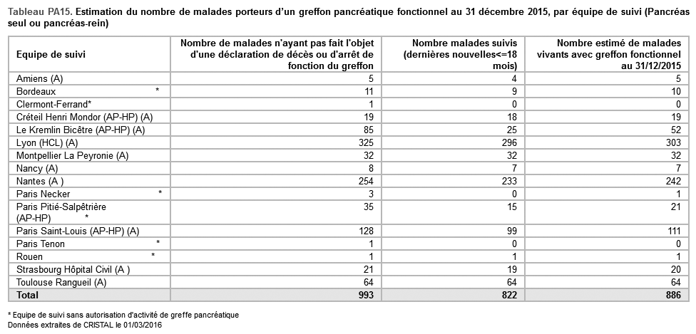 Depuis 1976, année de la première greffe pancréatique enregistrée dans Cristal, un total de 1 923 greffes pancréatiques a été enregistré. Le nombre estimé de malades porteurs d’un greffon pancréatique est de 886 au 31 décembre 2015, soit une prévalence de l’ordre de 13,3 par million d’habitants (pmh).