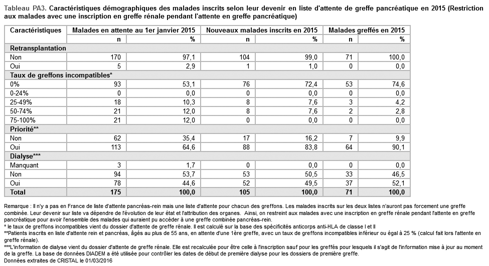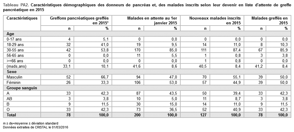 Tableau PA2. Caractéristiques démographiques des donneurs de pancréas et, des malades inscrits selon leur devenir en liste d'attente de greffe pancréatique en 2015
