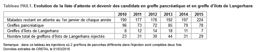 Tableau PAIL1. Evolution de la liste d'attente et devenir des candidats en greffe pancréatique et en greffe d’îlots de Langerhans