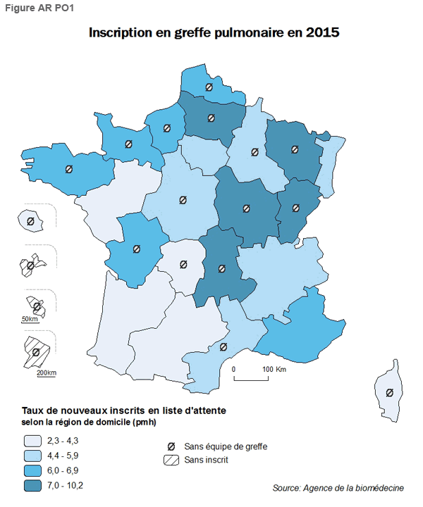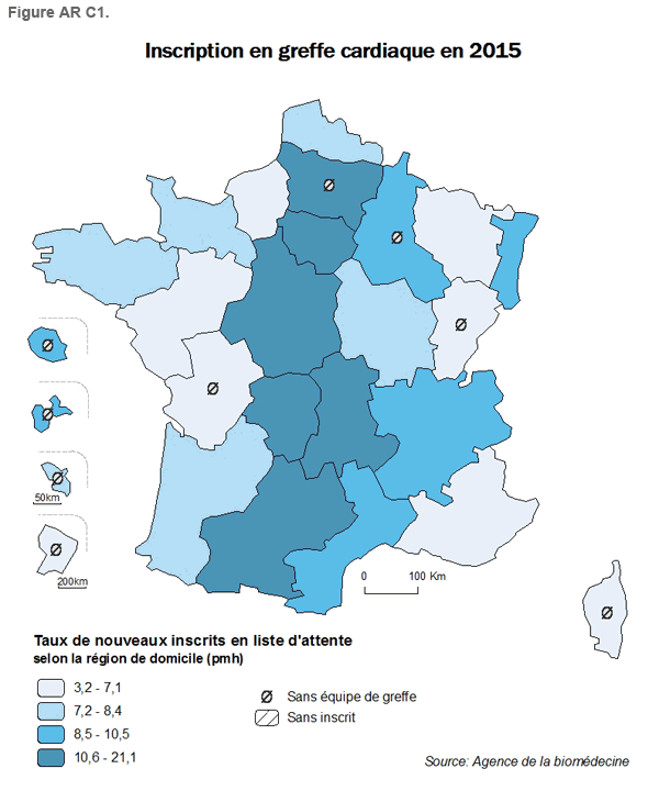 Le taux de nouveaux malades inscrits sur la liste d’attente de greffe cardiaque en 2015 en France est de 9,4 pmh (Tableau 1) alors qu’il était de 7,2 pmh en 2010 (Tableau 2) ce qui correspond à une augmentation de 31% en 6 ans. Il y a en France métropolitaine des disparités régionales notables puisque ce taux varie de 21,1 (Limousin) à 3,2 pmh (Corse) (Tableau 1). Parmi les 25 régions d’avant la réforme territoriale, 9 d’entre elles (4 régions d’outre-mer, Champagne-Ardenne, Corse, Franche-Comté, Picardie et Poitou-Charentes) sont dépourvues d’équipe de greffe cardiaque (Figure AR C1). Huit régions ont un taux d’inscription en liste d’attente supérieur à 10,4 pmh1 (Alsace, Auvergne, Centre, Ile-de-France, Languedoc-Roussillon, Limousin, Midi-Pyrénées, Picardie). Treize régions ont un taux de nouveaux inscrits inférieur à 8,4 pmh1 (Aquitaine, Basse-Normandie, Bretagne, Corse, Franche-Comté, Guyane, Haute-Normandie, Lorraine, Martinique, Nord-Pas-de-Calais, Pays de la Loire, Poitou-Charentes, Provence-Alpes-Côte d’Azur) (Tableau 1 et Figure AR C1). Ainsi parmi les 4 régions d’outre-mer deux ont un taux de nouveaux inscrits au-dessus de la moyenne nationale (Guadeloupe, La Réunion) et deux en dessous (Guyane, Martinique).