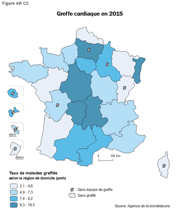 Le taux de greffe cardiaque en 2015 en France (7,1 pmh) est en augmentation par rapport à 2014 (6,4 pmh) et en hausse de 29% depuis 2010 (Tableau 1 et Tableau 2). En France métropolitaine des disparités régionales notables persistent puisque le taux de greffe cardiaque va de 18,5 pmh (Limousin) à 2,1 pmh (Lorraine). Dans 6 régions, le taux de greffe cardiaque est supérieur à 8,6 pmh2 (Alsace, Auvergne, Centre, Ile-de-France, Limousin, Picardie) et dans 9 régions il est inférieur à 5,6 pmh2 (Aquitaine, Corse, Franche-Comté, Guyane, Lorraine, Pays de la Loire, Nord-Pas-de-Calais, Pays de la Loire, Poitou-Charentes, Provence-Alpes-Côte d’Azur). Parmi les 6 régions métropolitaines qui ont un taux d’inscription sur la liste d’attente supérieur à 10,6 pmh (Figure AR C1), toutes ont une activité de greffe élevé (Figure AR C2). Les 6 régions métropolitaines qui ont un taux de malades greffés inférieur à 4,8 pmh2 (Figure AR C2) ont un taux de nouveaux malades inscrits sur la liste d’attente faible .Ainsi les disparités régionales d’activité de greffe cardiaque sont associées à l’activité d’inscription sans relation évidente entre la cause et la conséquence.