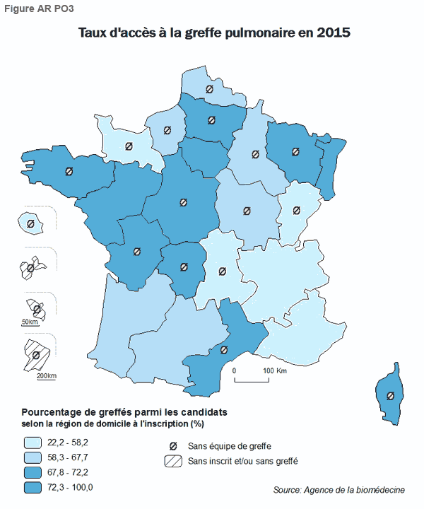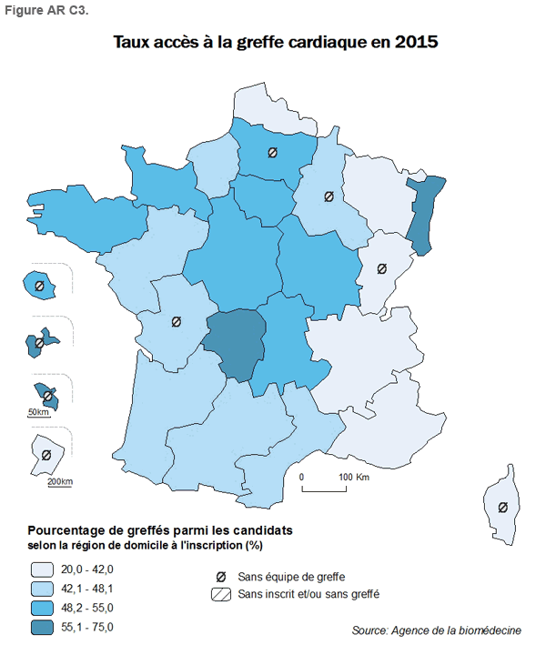 En 2015, le pourcentage de malades inscrits (total des candidats) sur la liste d’attente ayant bénéficié d’une greffe cardiaque dans l’année est de 48,1% alors qu’il était de 46,7% en 2014. Ce pourcentage varie en France métropolitaine de 72% (Alsace) à 27,8% (Lorraine). Les 4 régions d’outre-mer sont des régions de contraste mais avec des effectifs faibles (Tableau 1). Parmi les 5 régions de France métropolitaine (Alsace, Basse-Normandie, Bourgogne, Bretagne, Limousin) qui ont 55% ou plus des inscrits greffés, 3 ont un taux de greffes supérieur au taux national. Parmi les 5 régions de France métropolitaine (Corse, Franche-Comté, Lorraine, Nord-Pas-de-Calais, Provence-Alpes-Côte d’Azur) qui ont un taux d’accès à la greffe inférieur ou égal à 40%, toutes ont un taux de greffe inférieur au taux national, et, aucune n’a un taux d’inscription supérieur au taux national. Ces constats incitent à élargir l’analyse des particularités régionales en termes d’accès à la greffe cardiaque à celle des particularités régionales en termes de parcours de soin des malades au sein de la filière de prise en charge de l’insuffisance cardiaque.