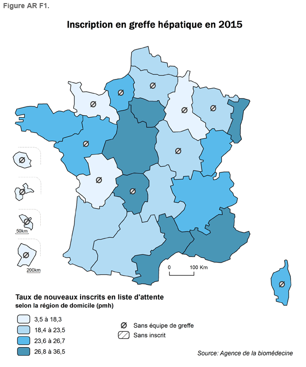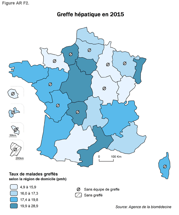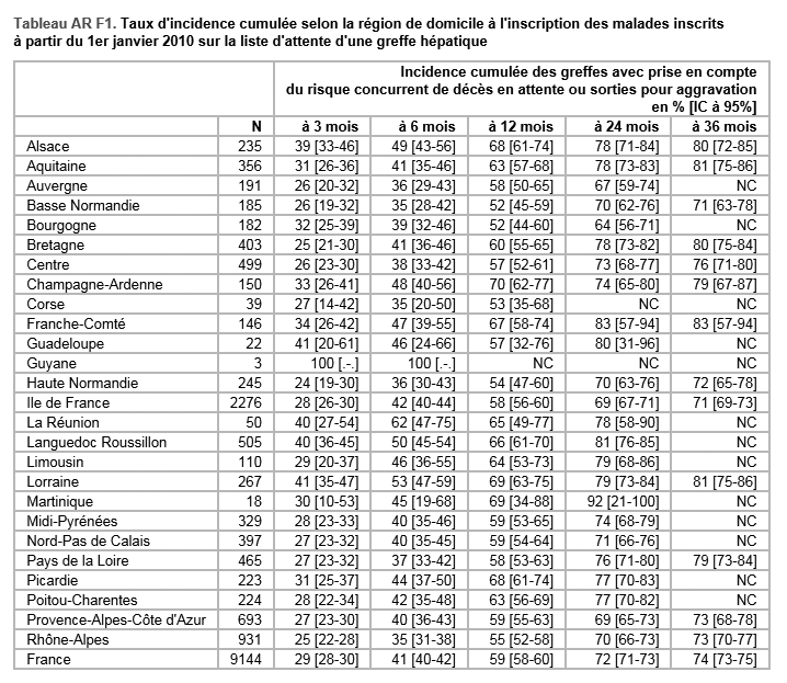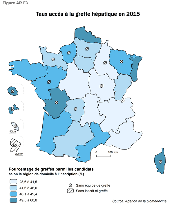 Pour la greffe hépatique, l'analyse de l'accès à la greffe a été faite en excluant les malades candidats et greffés à partir d’un greffon de donneur vivant et les malades bénéficiant d’une priorité au titre de la super-urgence.