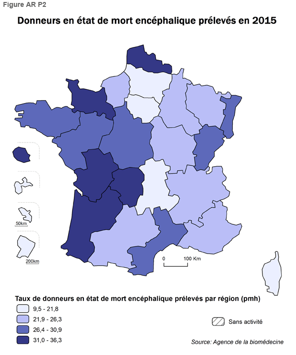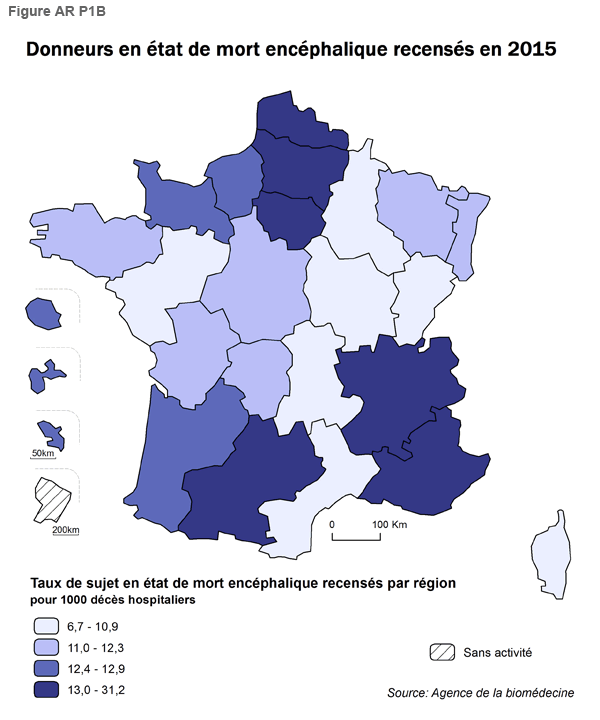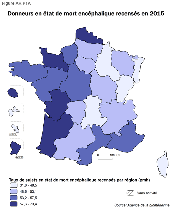 En 2015, le taux de recensement est stabilisé à 53,8 donneurs recensés en état de mort encéphalique par million d’habitants (pmh) contre 53,6 pmh en 2014, soit 3 579 donneurs recensés. Les régions qui ont les taux de recensement les plus élevés en 2015 (> 57,6 pmh) se situent dans l’Ouest (Poitou-Charentes, Aquitaine) ainsi que dans le Nord-Pas-De-Calais et la Basse Normandie. La Guyane a aussi en 2015 un fort taux de recensement. Les régions Auvergne, Corse, Guadeloupe, Champagne Ardenne, Martinique ont les taux de recensement les moins élevés en 2015 (< 48,5 pmh) (Figure AR P1A).