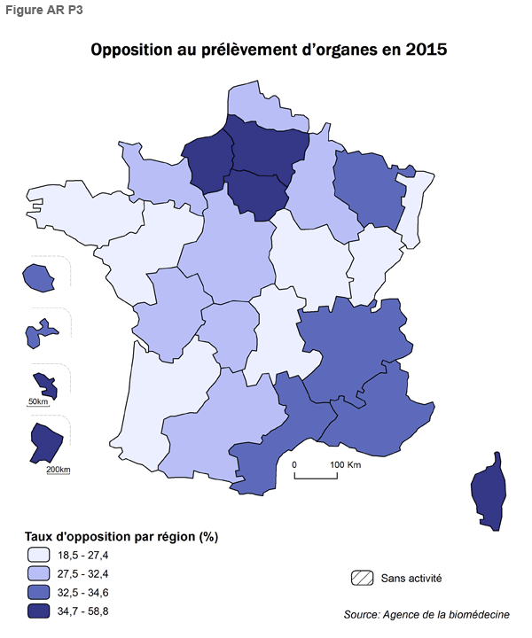 Sept régions (Aquitaine, Alsace, Auvergne, Bretagne, Pays de Loire, Bourgogne, et Franche-Comté), ont les taux d’opposition les plus faibles (< 27,4%); à noter que 4 de ces régions avaient déjà les taux les plus faibles en 2014 (Figure AR P3). Les taux d’opposition les plus élevés (≥ 34,7%) se situent en Picardie, Martinique, Ile-de-France, Haute Normandie, Guyane et Corse.