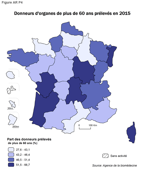 Le taux de prélèvement d’organes a progressé en 2015 (26,6 pmh contre 25 pmh en 2014); le nombre de donneurs prélevés en état de mort encéphalique en 2015 est de 1769 contre 1655 en 2014. Les régions qui atteignent les taux de prélèvement les plus élevés (> 31 pmh) se situent à l’Ouest (Limousin, Poitou-Charentes, Aquitaine), et en région Nord-Pas-De-Calais et Basse Normandie. L’île de la Réunion a fortement progressé en 2015 pour être aujourd’hui parmi les meilleures (33,2 donneurs prélevés pmh). Les régions Alsace, Haute Normandie, Basse Normandie, Bretagne, Pays de la Loire, Midi-Pyrénées, PACA, ont vu leur activité de prélèvement progresser. Les régions Ile de France, Picardie, Auvergne ont un taux de donneurs prélevés pmh inférieur à 21,8 pmh. La variation du taux de prélèvement entre 2015 et 2014 diffère selon l’organe et l’âge des donneurs. La part des donneurs prélevés de plus de 60 ans est de 46,5%, soit 3% de moins qu’en 2014.