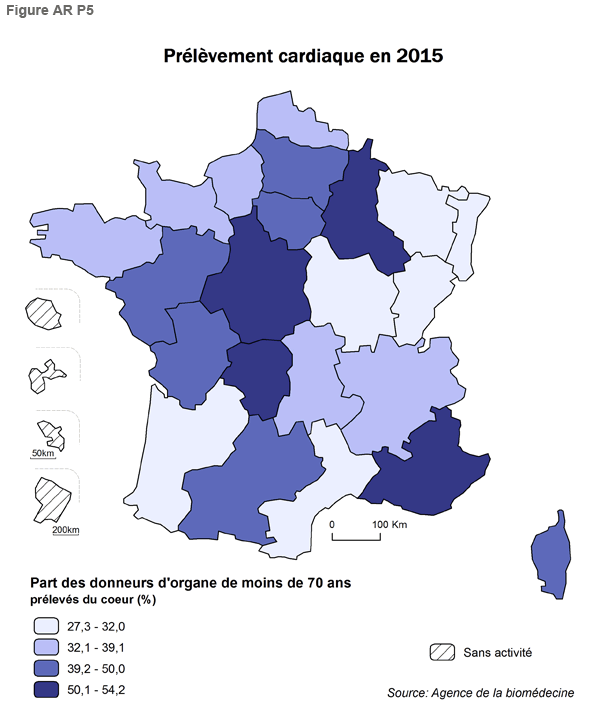 - Le prélèvement cardiaque chez les donneurs âgés de moins de 70 ans atteint 39,6%. La tranche d’âge 50 - 64 ans est celle qui progresse le plus depuis 2013. Les régions PACA, Champagne Ardenne, Centre, Limousin ont les taux de donneur de cœur les plus élevés. (Figure AR P5)
