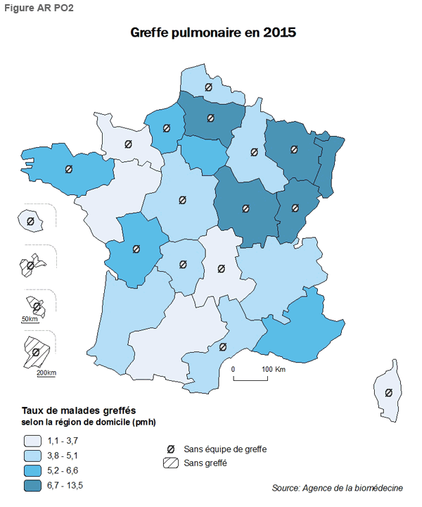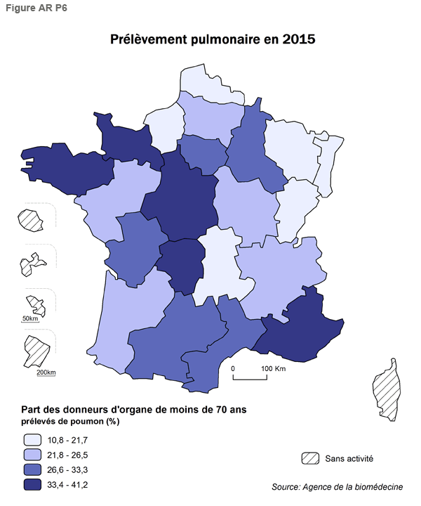 - Le prélèvement pulmonaire chez les donneurs de moins de 70 ans (Figure AR P6) est de 26% (tab 1). Il est supérieur à 33,4% des donneurs en PACA, Centre, Limousin, Basse Normandie et Bretagne. Il est à noter qu’une bonne partie des centres qui ont un fort taux de prélèvement de cœur, ont un fort taux de prélèvement de poumon.