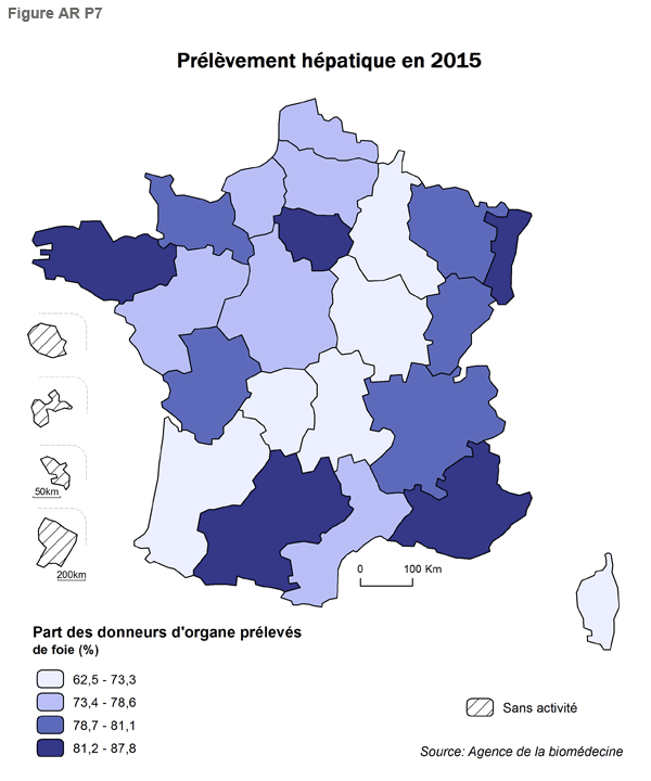 - Le prélèvement hépatique (Figure AR P7) est important (77% des donneurs). Dans 5 régions, il est supérieur à 81,2% (Alsace, PACA, Bretagne, Midi-Pyrénées, Ile de France). Toutes ces régions à fort taux de prélèvement hépatique ont également des équipes de greffe hépatique actives.