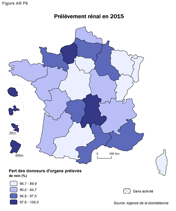 - Pour le prélèvement rénal (Figure AR P8), le taux de donneurs prélevés d’un rein atteint cette année 91,9%. Deux régions métropolitaines : Auvergne et Haute Normandie, ont un taux de prélèvement rénal supérieur à 97,6%.