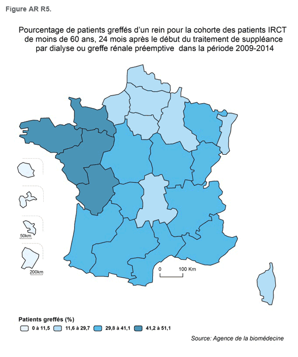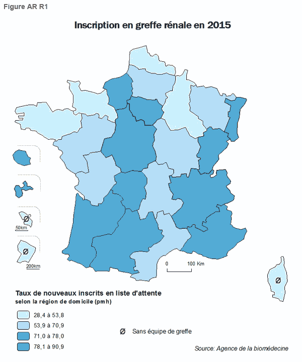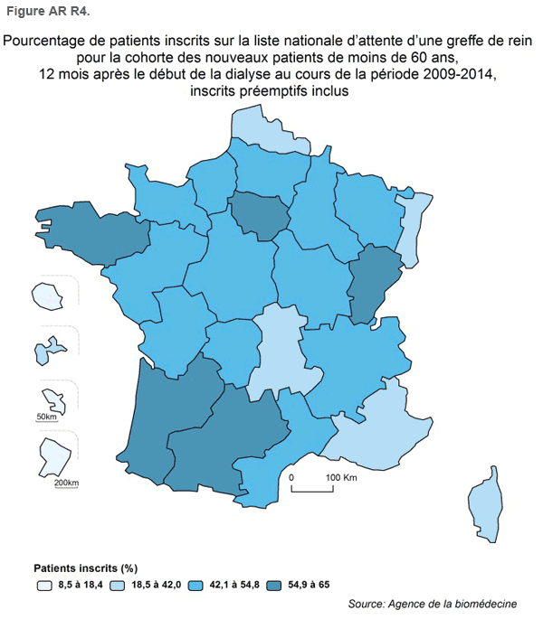 Au cours de la période 2009-2014, en France 15 362 nouveaux patients ont débuté la dialyse et ont été inscrits sur liste d’attente de greffe rénale. Les patients inscrits sur la liste d’attente de façon préemptive sont inclus. Les inscriptions préemptives représentent 17,5% des inscriptions sur l’ensemble du territoire (Rapport 2014 REIN). Si on exclut les DOM TOM, c’est en en Aquitaine (25,3%), en Bretagne (23,5%) et en Ile-de- France (22,3%) qu’elles ont été les plus fréquentes tandis qu’elles sont les plus faibles en Corse (8%), en Alsace (8,2%) et en Auvergne (9,1%). Après 12 mois de traitement suppléance, sur l’ensemble du territoire, 50% des patients étaient inscrits avec des variations importantes selon les régions. Les régions qui ont le plus inscrit sont l’Ile-de-France (65%), la Franche-Comté (62,3%), l’Aquitaine et Midi-Pyrénées (61,4%),
