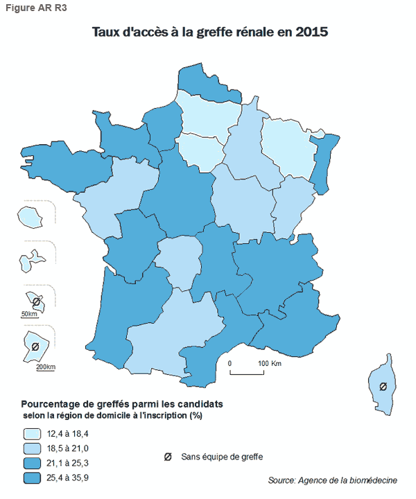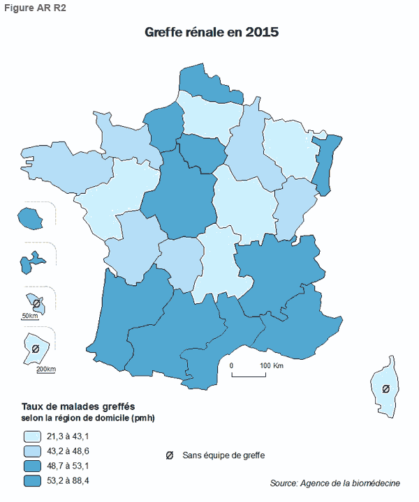 Le pourcentage de greffés, parmi les candidats selon la région de domiciliation, indique le degré d’inadéquation entre l’offre en greffons rénaux et les besoins reflétés par les inscriptions en liste d’attente des malades domiciliés dans ces régions. L’offre en greffons dépend pour une part de l’activité de prélèvement de la région, avec un des reins des donneurs attribués au niveau local (l’autre étant mutualisé au niveau national) et de l’activité de greffe avec donneur vivant.