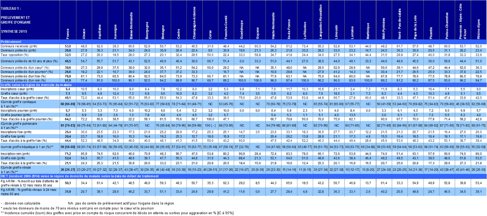 L’absence de chiffres ou de tableaux dans une région est le signe qu’il n’y a pas d’activité de prélèvement ou de greffe dans la région.