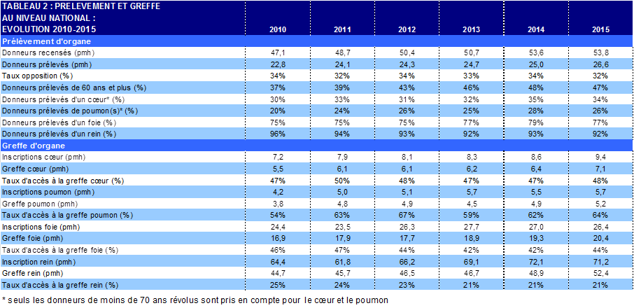 L’augmentation globale du taux de prélèvement en 2015 contribue probablement à l’augmentation du nombre de donneurs prélevés de cœur (+1,6%) et la stabilité du prélèvement de poumons. Malgré cette augmentation du nombre de donneurs et une hausse du nombre de donneurs de moins de 60 ans, le nombre d’organes prélevés par donneur et le nombre d’organes greffés par donneur ont légèrement baissé (3,37 vs 3,33, et 3,09 vs 3,07).