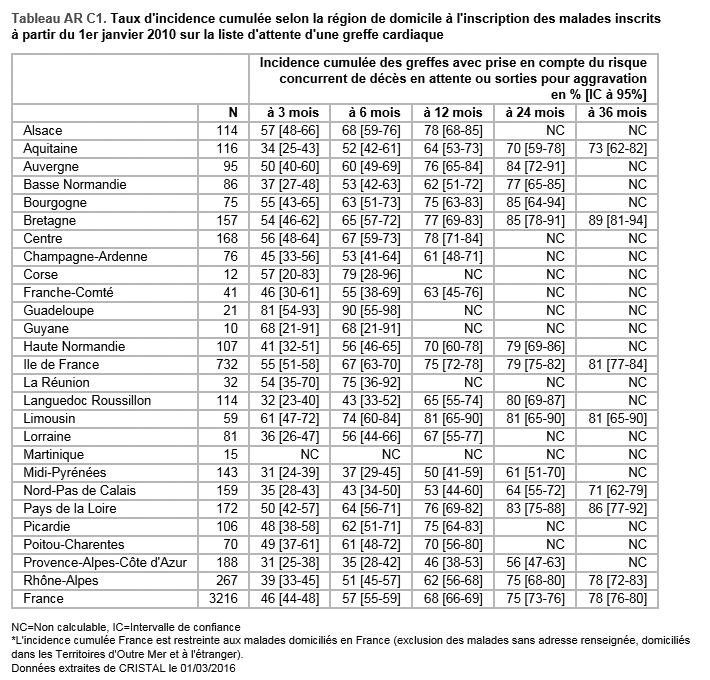 Tableau AR C1. Taux d'incidence cumulée selon la région de domicile à l'inscription des malades inscrits à partir du 1er janvier 2010 sur la liste d'attente d'une greffe cardiaque