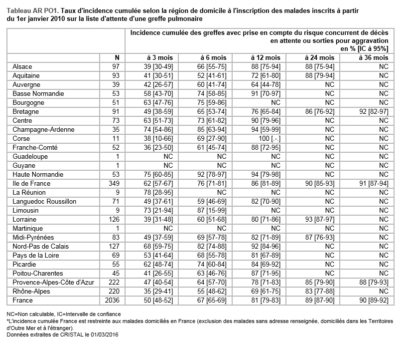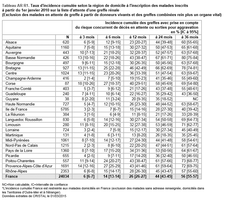 Pour les taux d’incidence cumulée d’accès à la greffe, c’est la région de résidence au moment de l’inscription qui a été prise en compte.